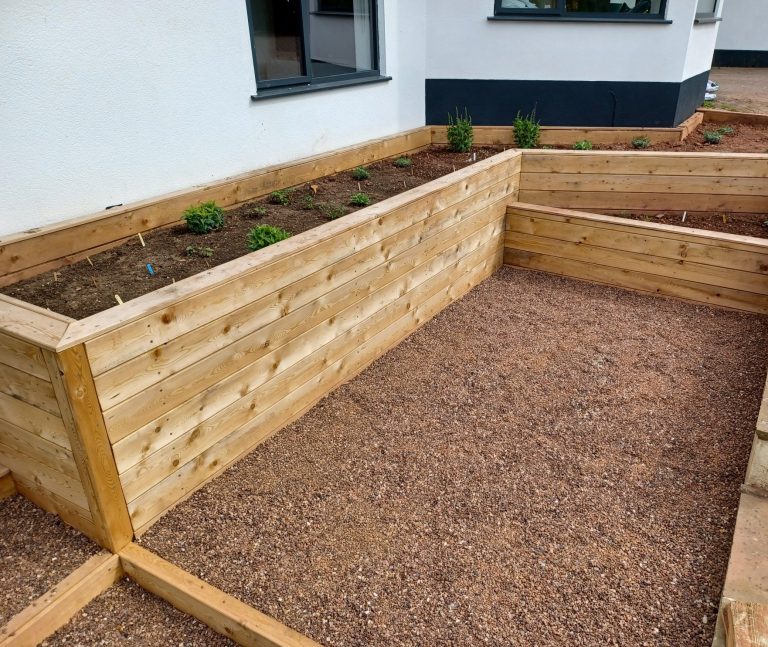 The main feature was the use of traditional timber railway sleepers to face the retaining walls, blending durability with natural charm.